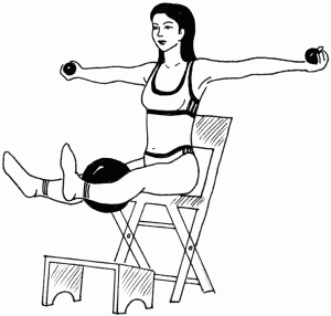 Исходное положение: сидя прямо, ноги выпрямлены перед собой и удерживаются на весу, руки выпрямлены в стороны на уровне плеч, ладони развернуты вверх и сжимают маленькие мячики, большой мяч зажат между колен.